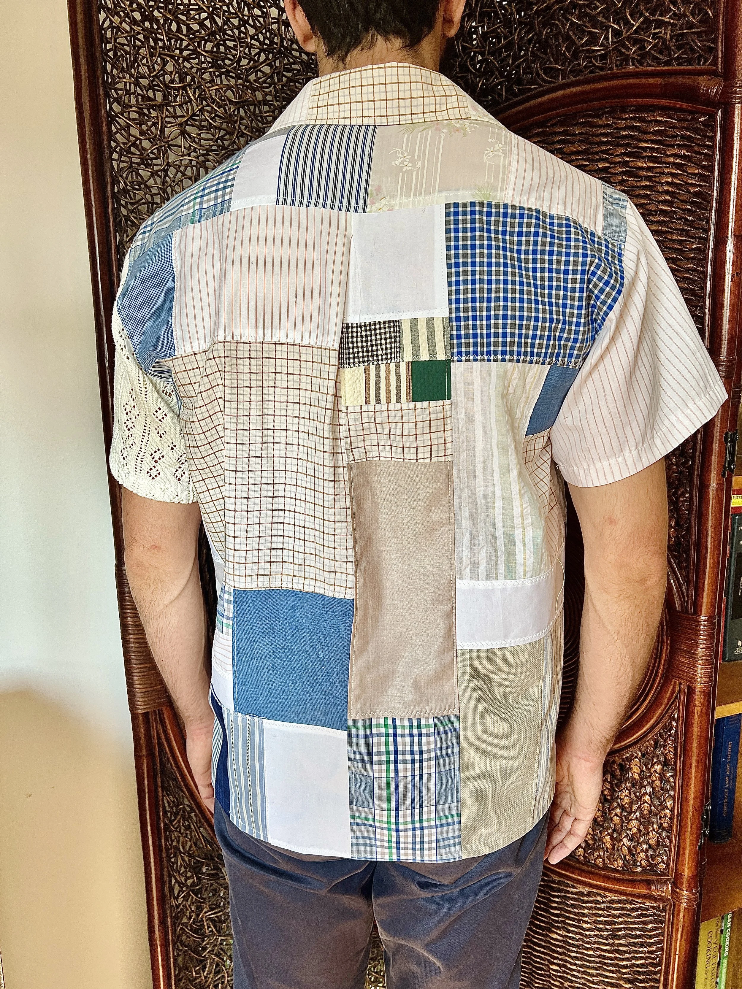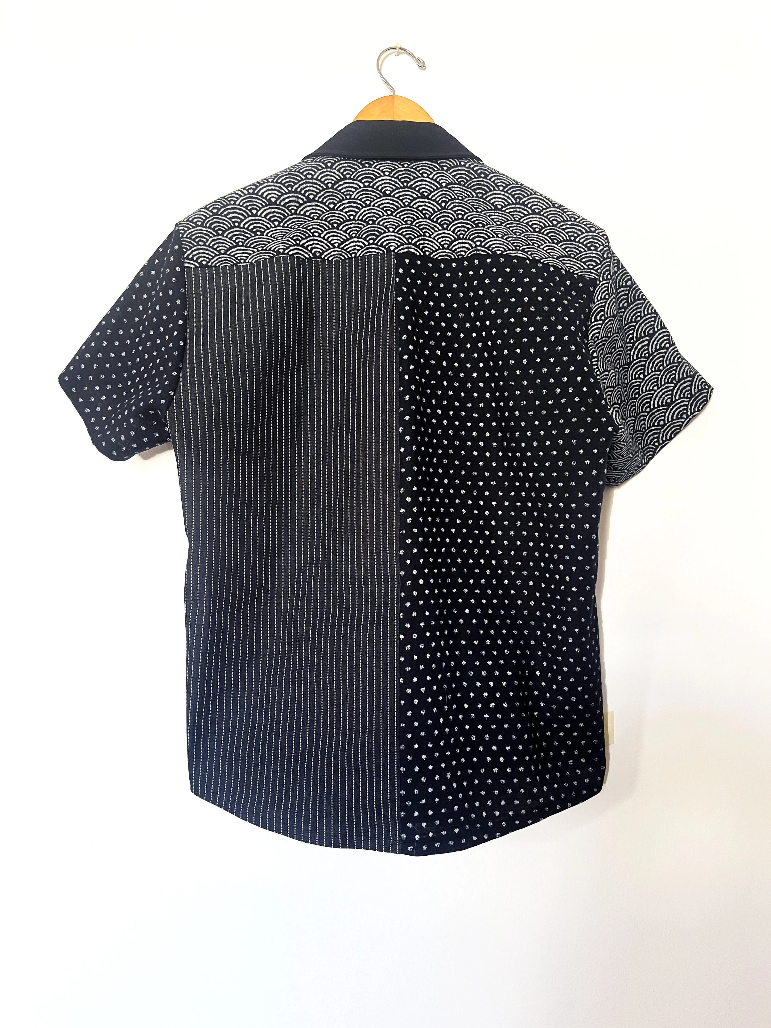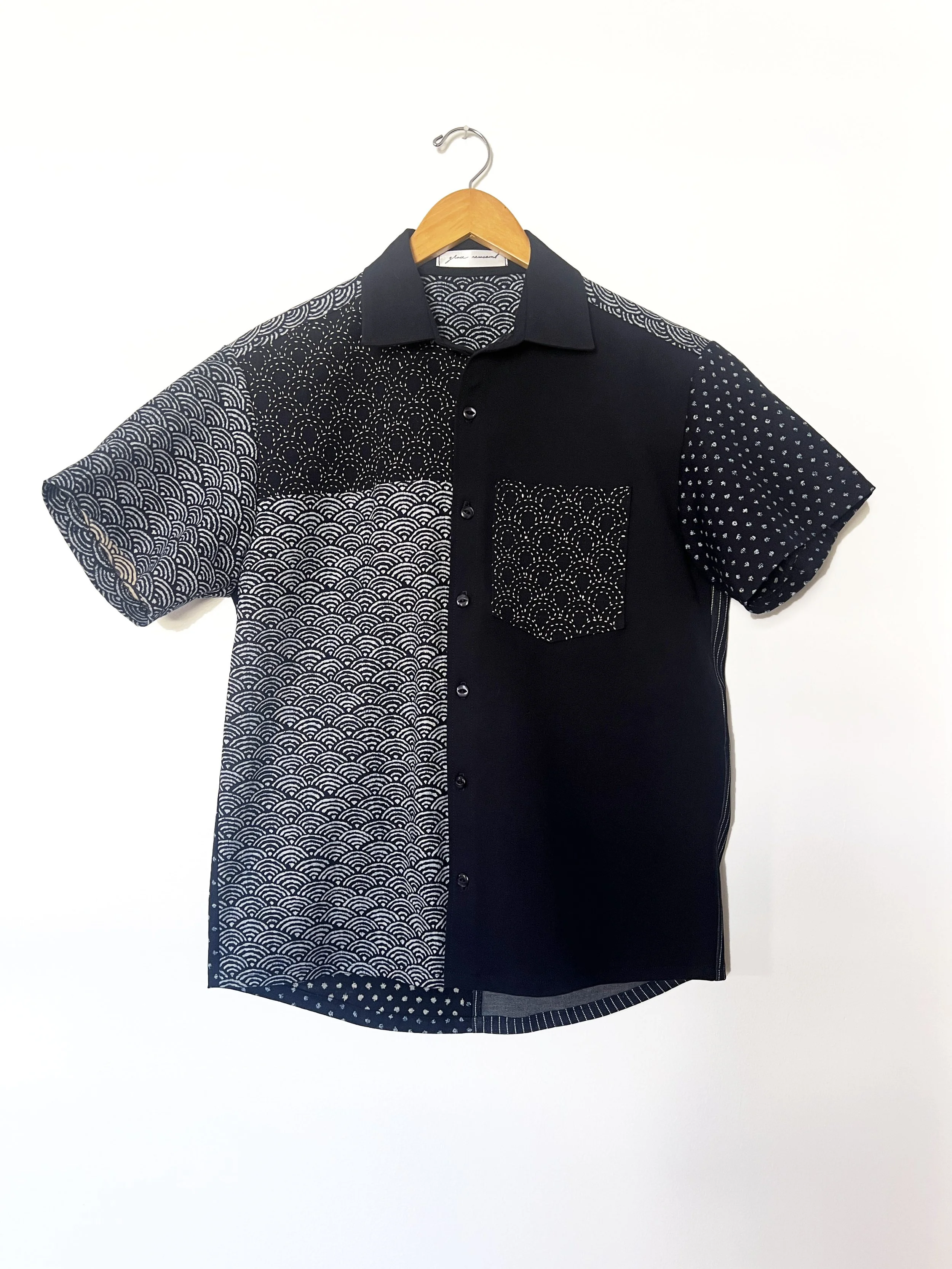 Mixed material shirt, made with Sashiko embroidered panels and Japanese style printed fabrics.