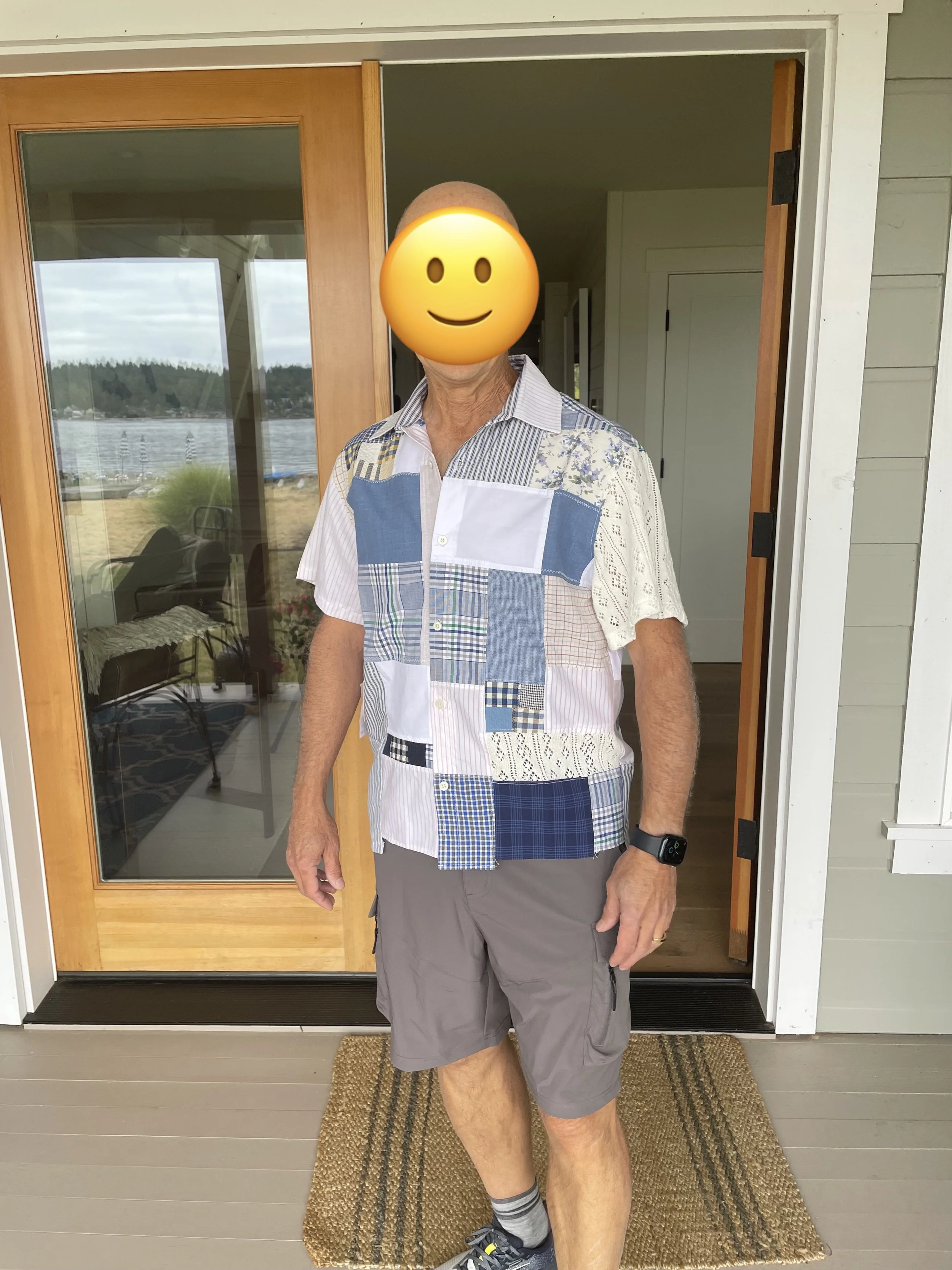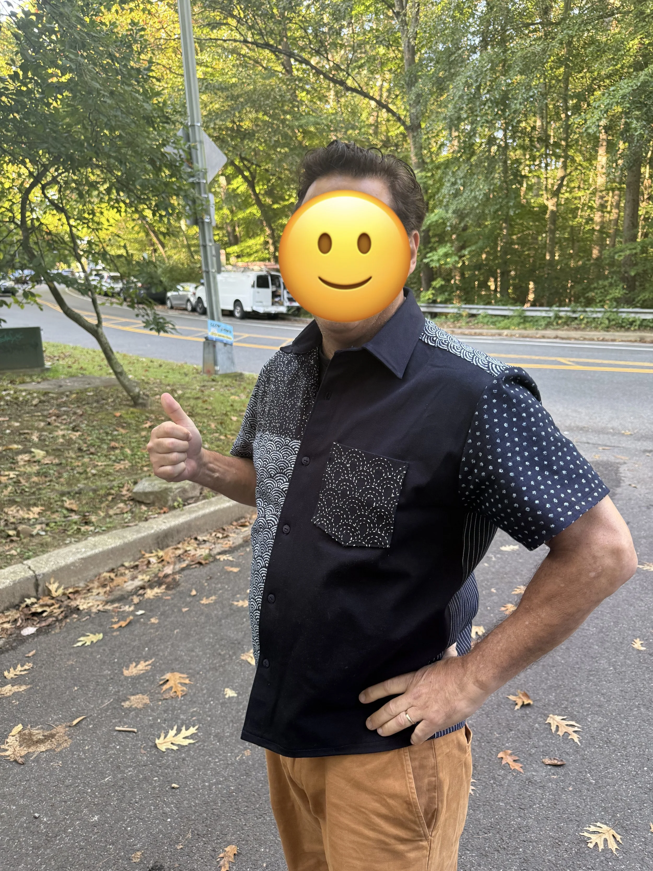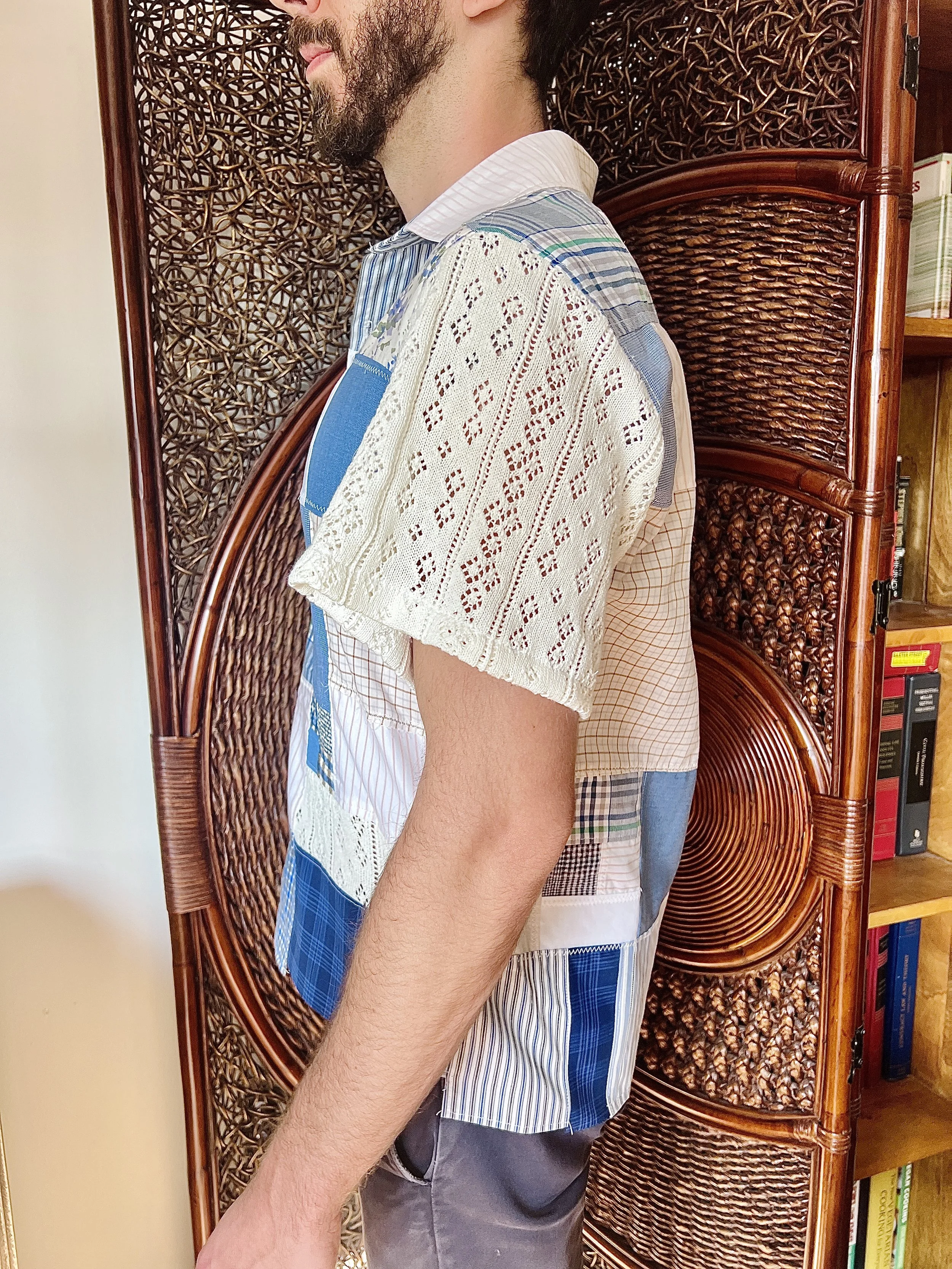 Mixed material shirt, made with Sashiko embroidered panels and Japanese style printed fabrics.