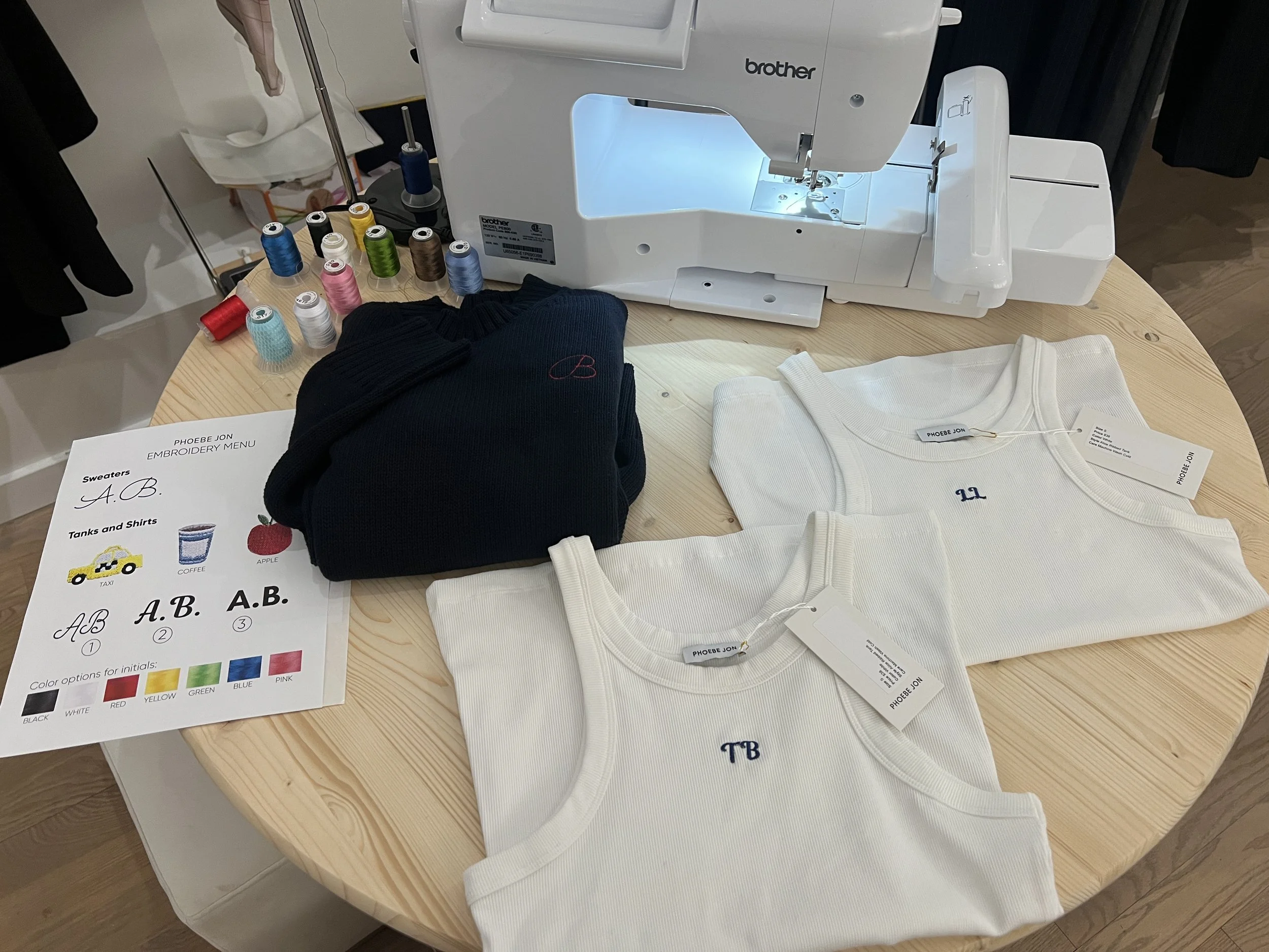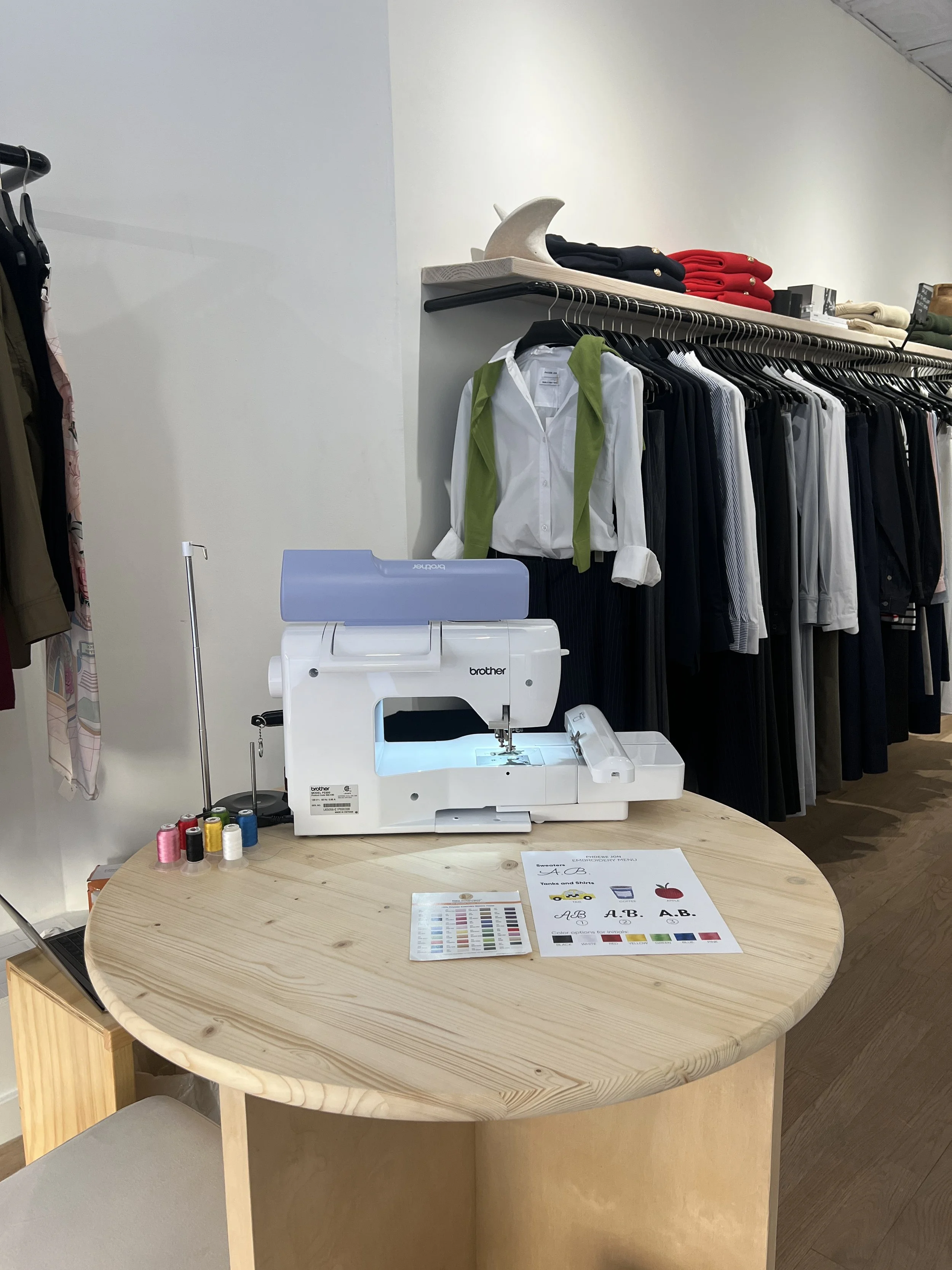 In celebration of Phoebe Jon’s 1 year anniversary, Grace was hired to embroider a selection of designs live at their event. After purchasing an item, the customer could bring their garment to Grace and select an embroidery from the pre-determined menu, including initials/lettering in 4 different fonts, and 3 small NYC-themed icons.